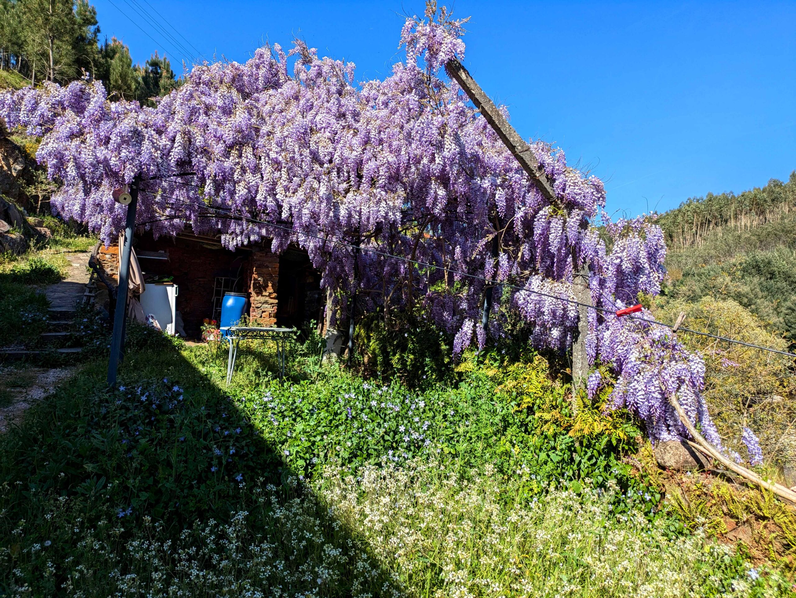 Fast könnte man schon an eine Invasion denken: Clycinien überwuchern unseren Pavillon und breiten sich über die Sommerküche und die Terrassenmauer weiter aus. Es sind Tausende von Blüten, die betörend duften und zahlreiche Insekten anlocken – vor allem die schwarze Holzbiene.