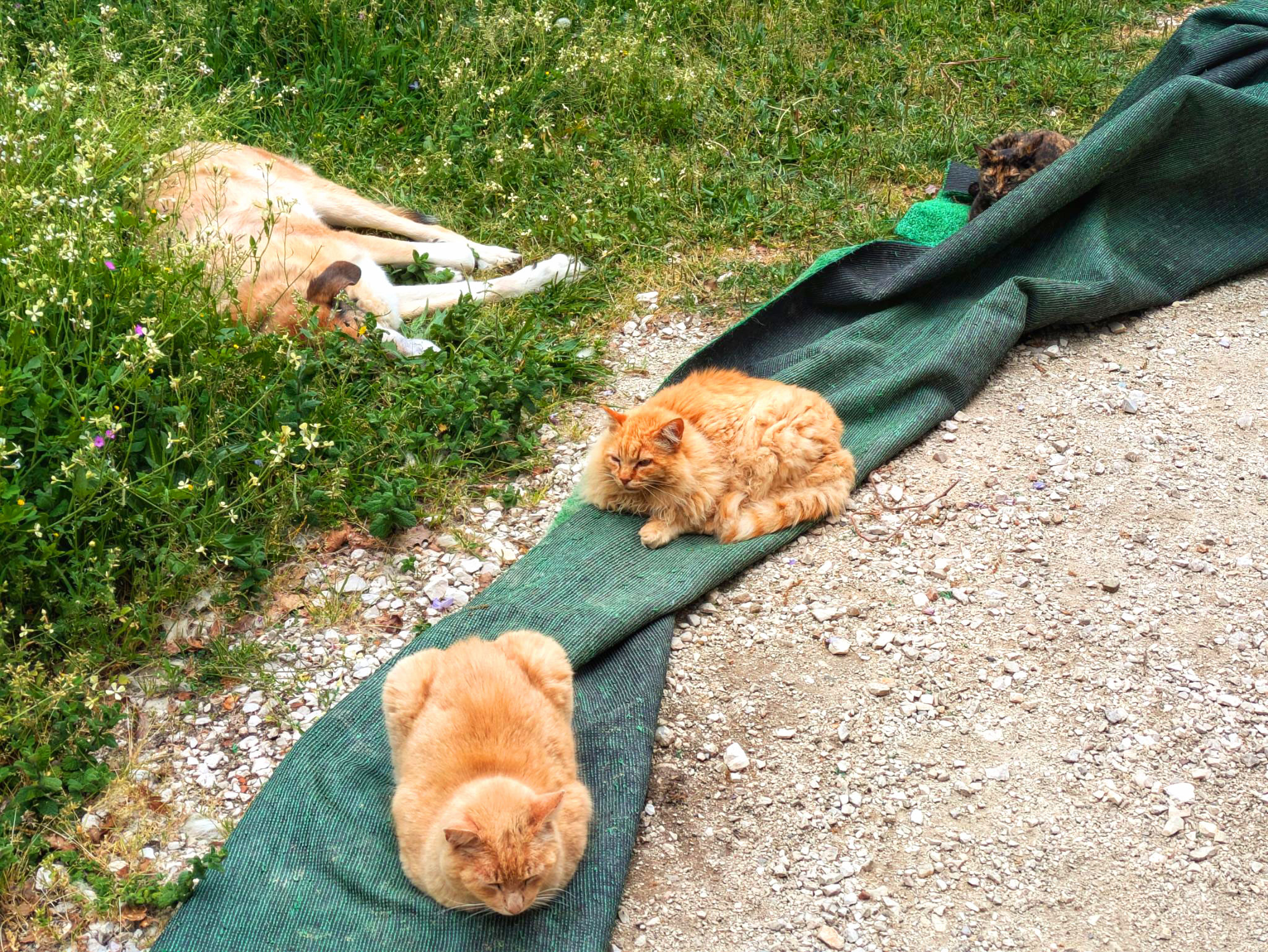 Normalerweise teilt Malaica ihren grünen Teppich den wir vom Knaubenhof mitgebracht haben mit den Katzen. Eine Windböe hat den Teppich jedoch aufgeworfen und zusammengeschoben, sodass nun nicht mehr alle Tiere Platz haben.