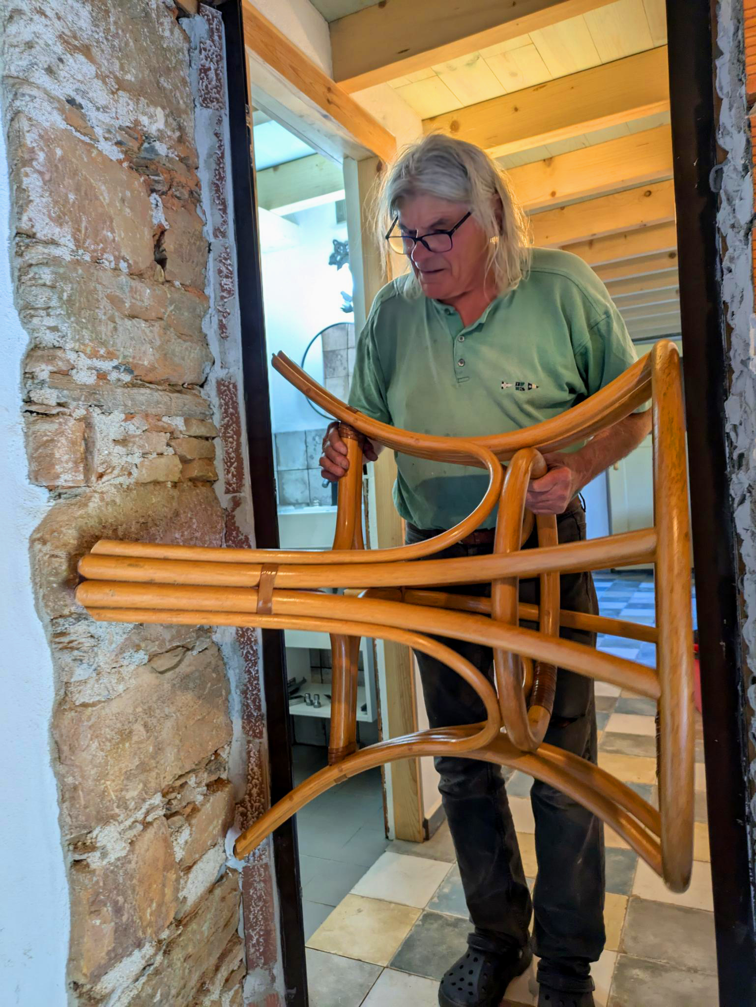 Nachdem wir ein Tischbein gekürzt hatten, nahmen wir einen neuen Anlauf – und siehe da, wir konnten den Tisch durch die Tür fädeln.