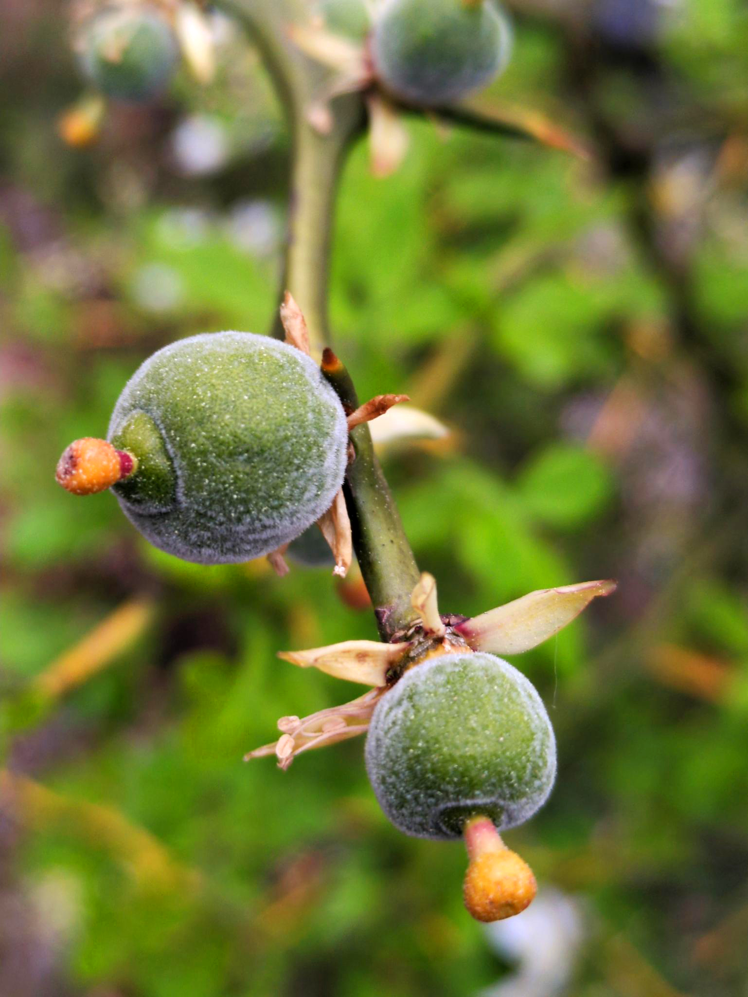 Das vor ca. zehn Jahren gepflanzte Orangenbäumchen wurde in seiner Vitalität im ersten Winter vom Frost existentiell geschädigt. Aus der Veredelunggrundlage hat es neu ausgetrieben und bringt jetzt nur noch wilde Früchte hervor. In den vergangenen Jahren haben sich immer mehr Früchte angesetzt.