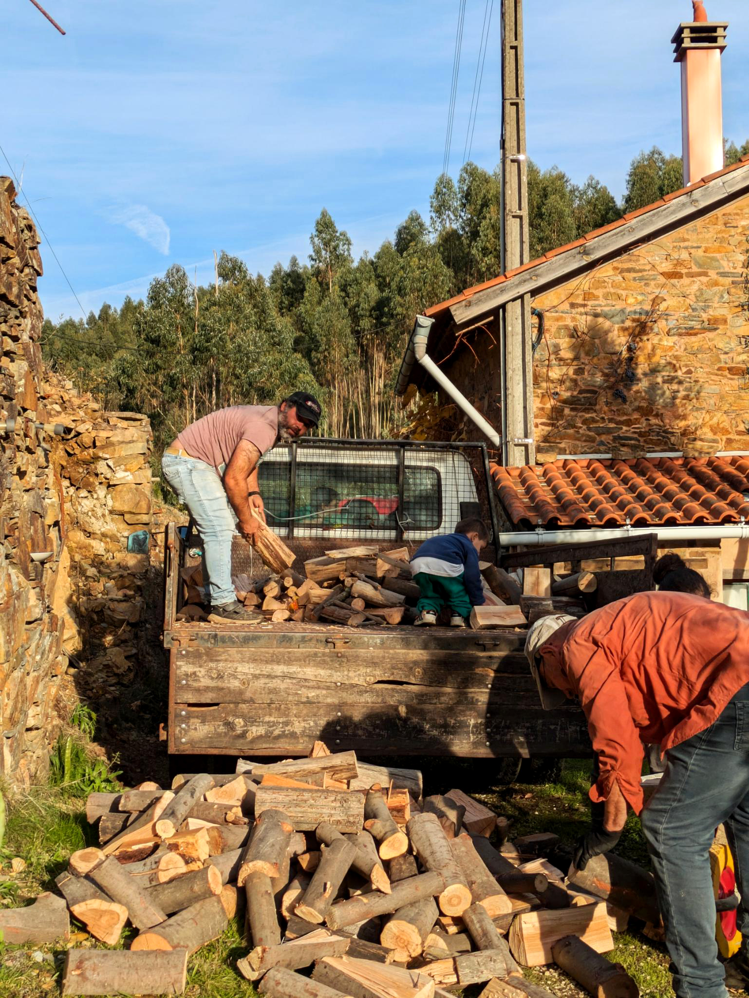 Holzaktion, junge Pinien ausforsten, Housekeeper, Holzlieferung, Eukalyptus,, Mimose, Goladinha, Portugal