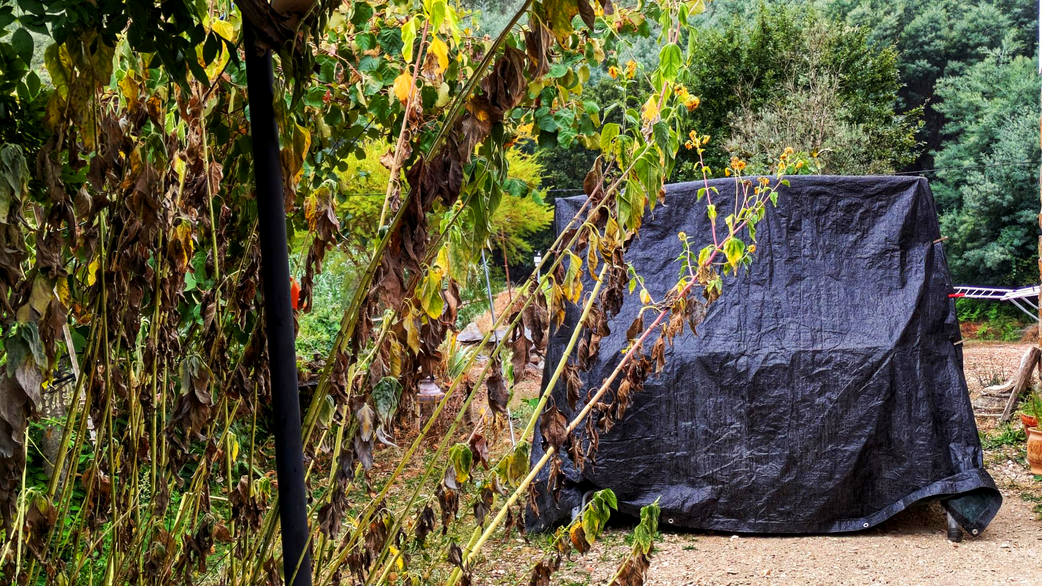 Die Topinambur welken vor sich hin. Die „Goladinha-Hollywood-Schaukel” musste eingepackt werden – Christo und Jeanne-Claude hätten es nicht perfekter machen können. Durch Verhüllen werden die Dinge neu wahrnehmbar.