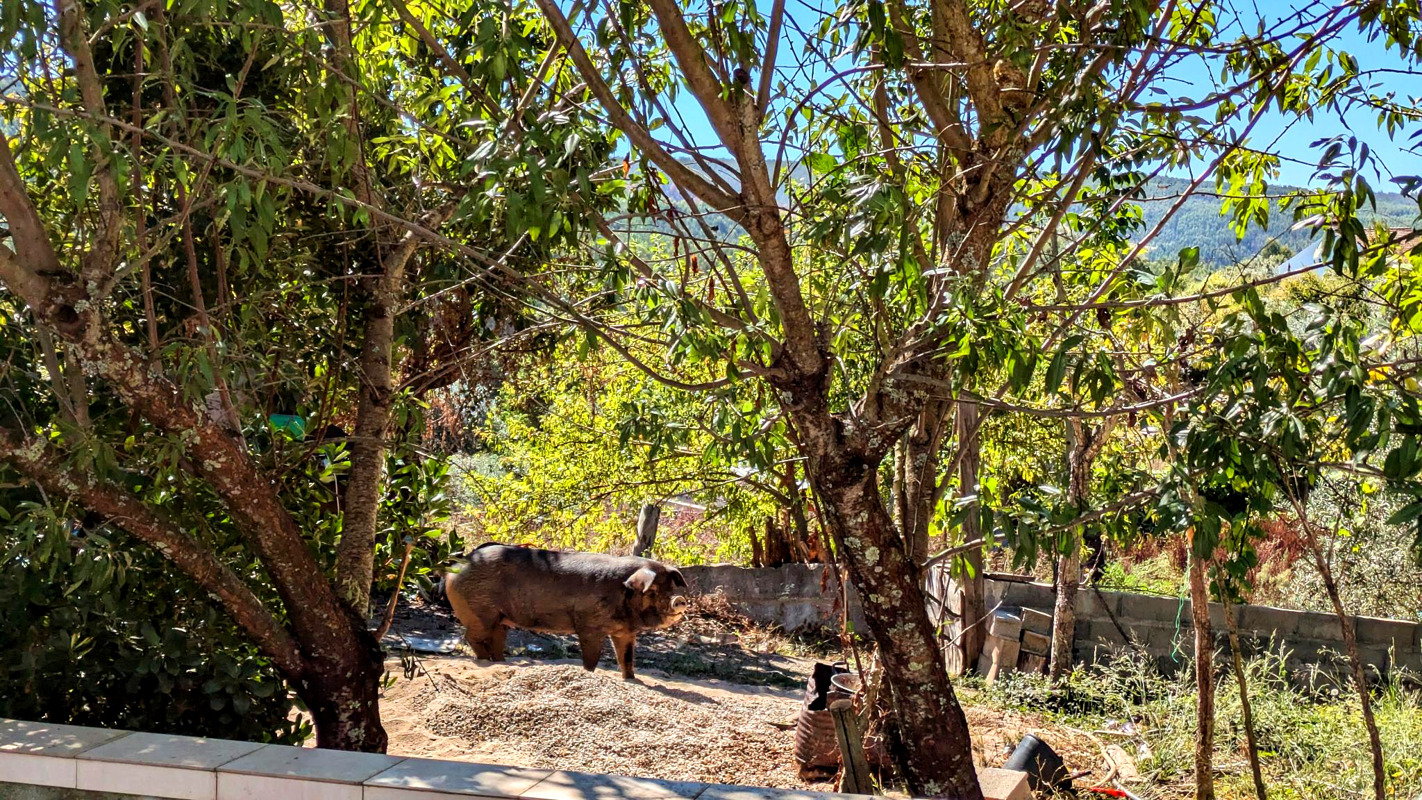 Auf dem Hofgelände des Schmieds in Vilas de Pedro läuft ein Schwein frei und munter herum. Es scheint sich um ein Schwarzes Iberisches Schwein zu handeln. Wie lange wird es wohl noch seine Freiheit bzw. sein Leben geniessen können?