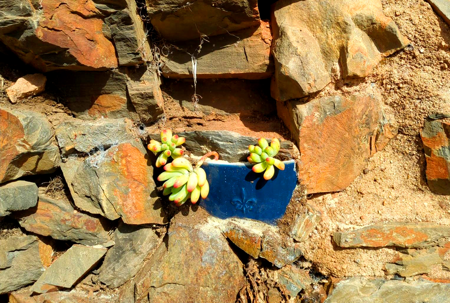 Unsere Haus, Hof und Katzenhüterin hat uns auch eine nette Anpflanzung in einer Natursteinmauer hinterlassen – Fechser einer Fetten-Hetten-Art.