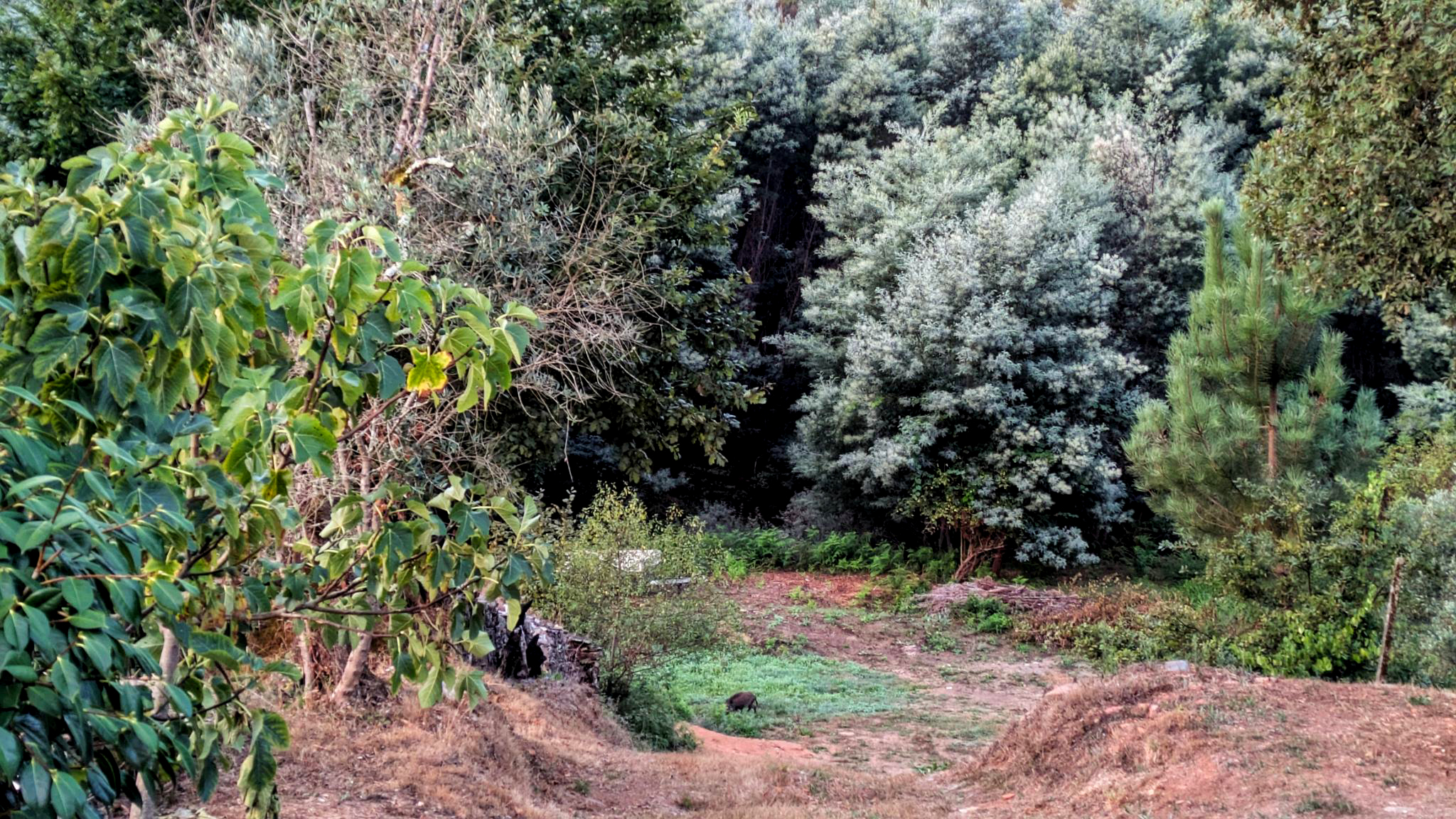 Als ich früh morgens aus dem Küchenfenster schaute, entdeckte ich ein Schwein unten im Tal. Es stand reglos da – den Kopf zu mir gerichtet. Erst als ich mich mit dem Fotoapparat näherte, horchte es auf. Als ich mich weiter näherte, machte es Anstalten zu fliehen. Eine Weile lang hielt es noch Blickkontakt, dann pirschte es mit einem lauten Brummen um die Ecke.