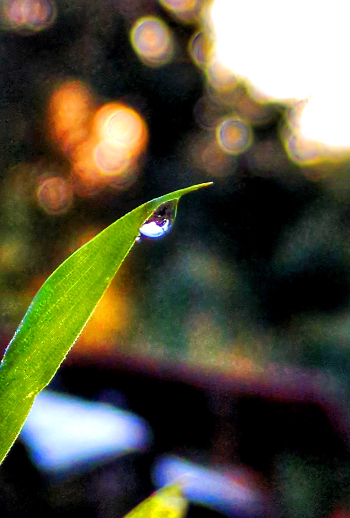 Die ersten Sonnenstrahlen erreichen ein Bambusblatt, auf dem sich ein Tautropfen gebildet hat.