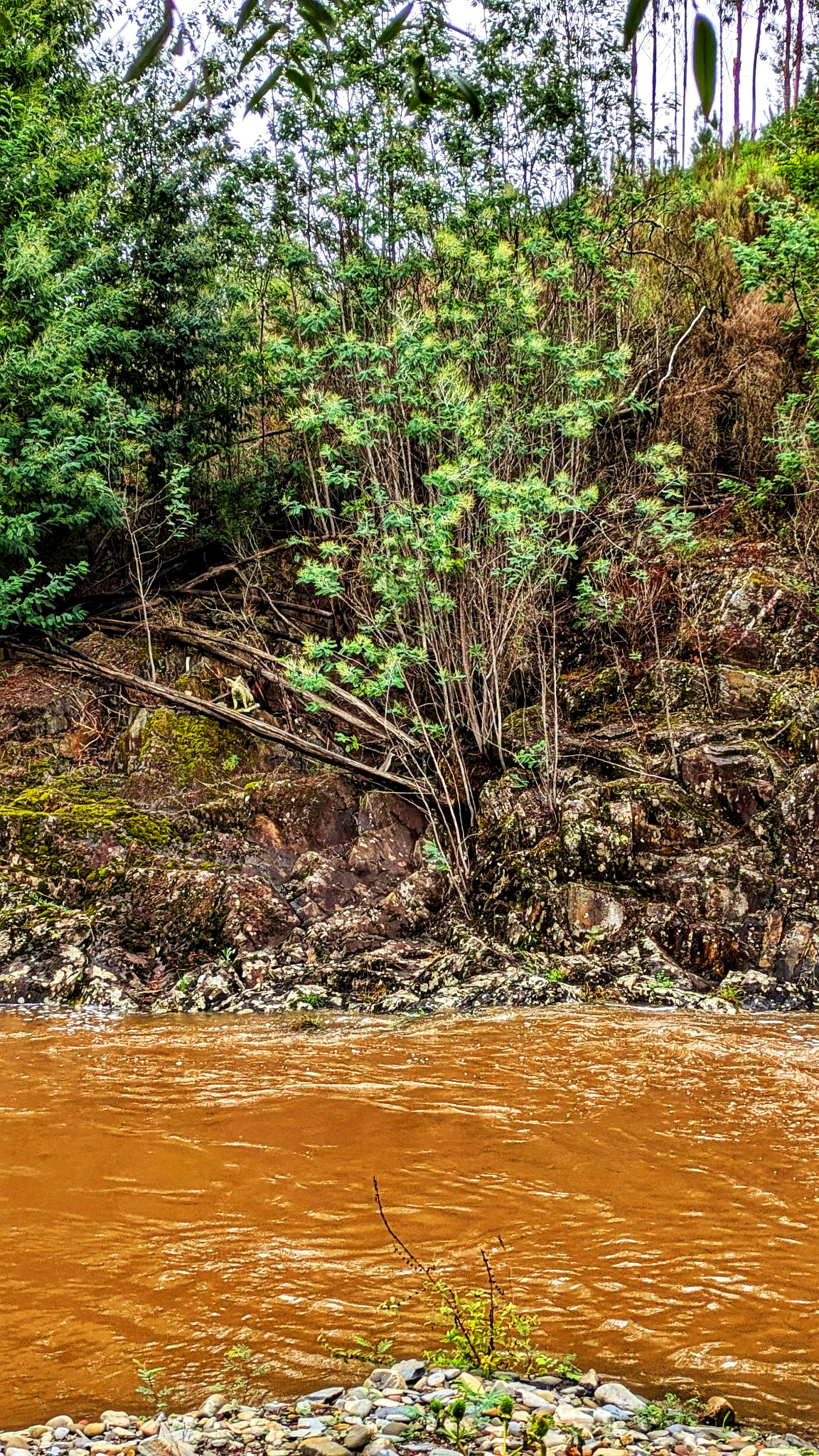 Zurück in Goladinha: Das Wasser der Alge wurde lehmig-braun von der Bodenerosion. Und nur gut, dass wir unser Schwein vor kurzem gegenüber hoch oben auf den Felsen gesetzt haben, ansonsten wäre es diesmal in den reissenden Fluten untergegangen.