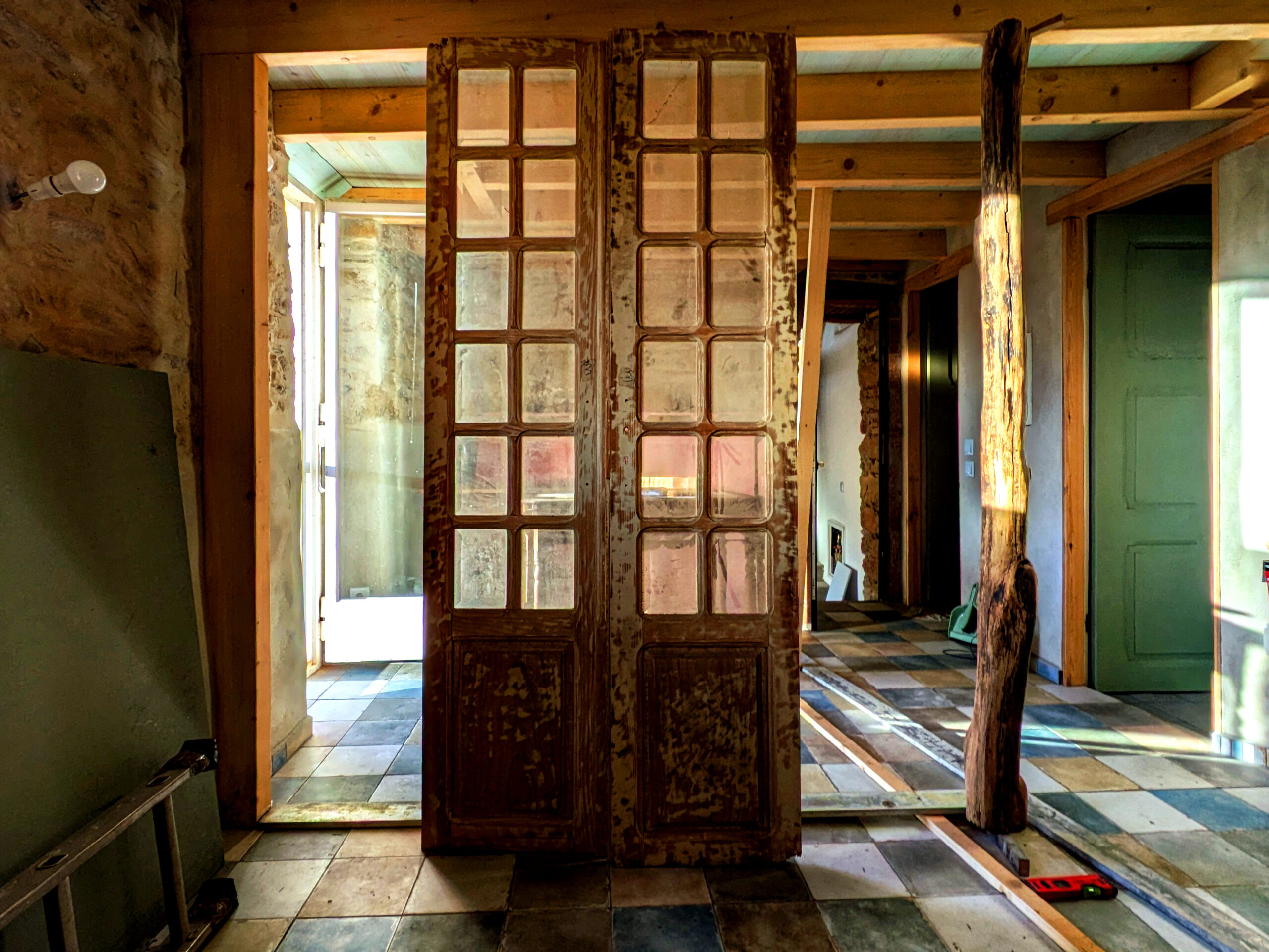 Vor ziemlich vielen Jahren haben wir aus einer Scheune in der Nähe von Marinha Grande einen ganzen Anhänger gebrauchter, z.Teil historischer Türen abgeholt – pro Tür bezahlten wir 10 Euro. Einige davon haben wir schon im Laufe der Restaurierungsarbeiten verbaut, zuletzt in Casa Madeira und in Casa Agua. Die Originalfarbe ist ein helles Grün. Da die Oberflächen teilweise schon schadhaft sind und die Farben doch nicht so recht passen, werden sie nun für einen passenden Anstrich vorbereitet.