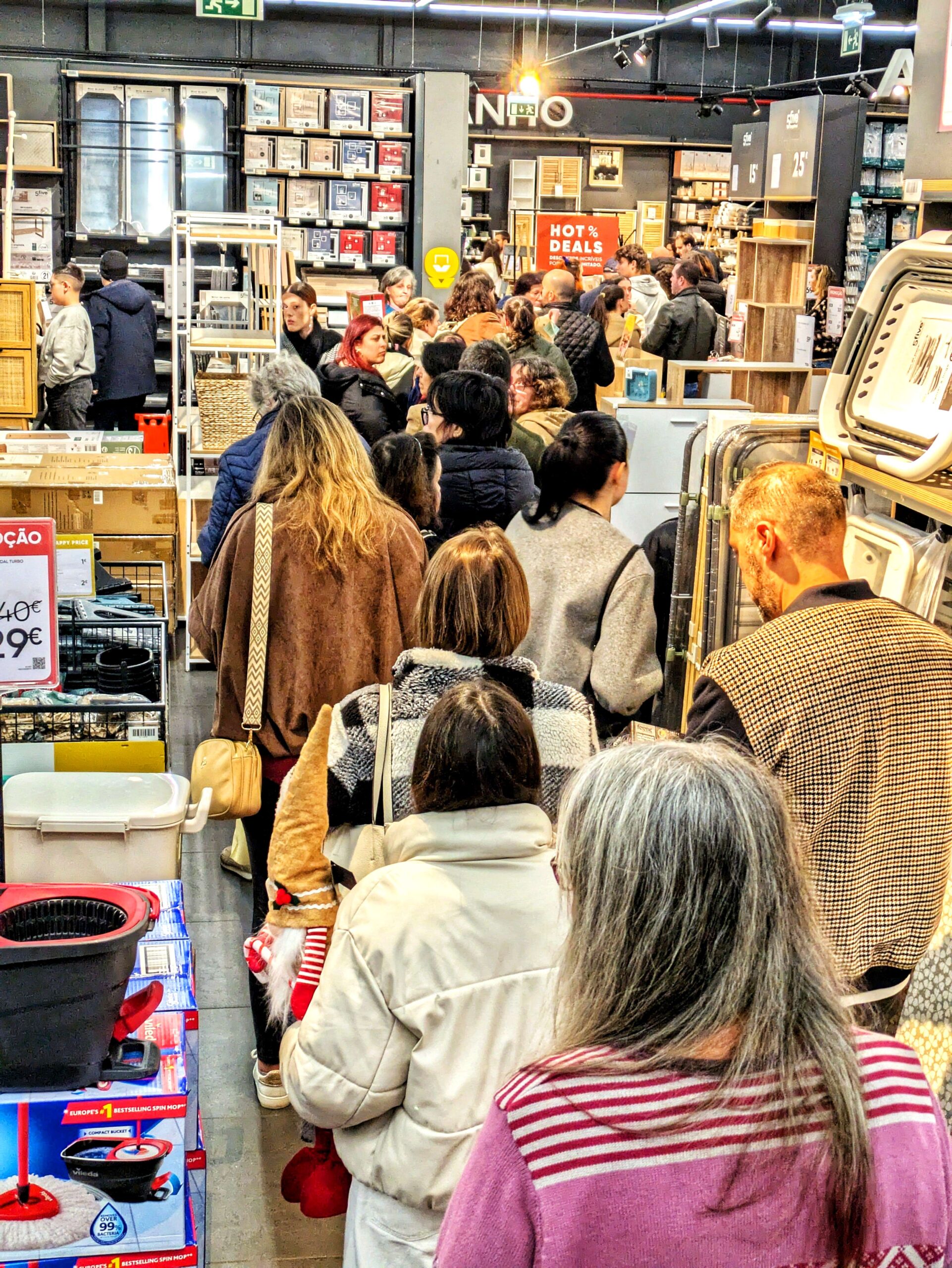 In einem Einrichtungshaus schlängelt sich die Warteschlange vor der Kasse durch den halben Laden.