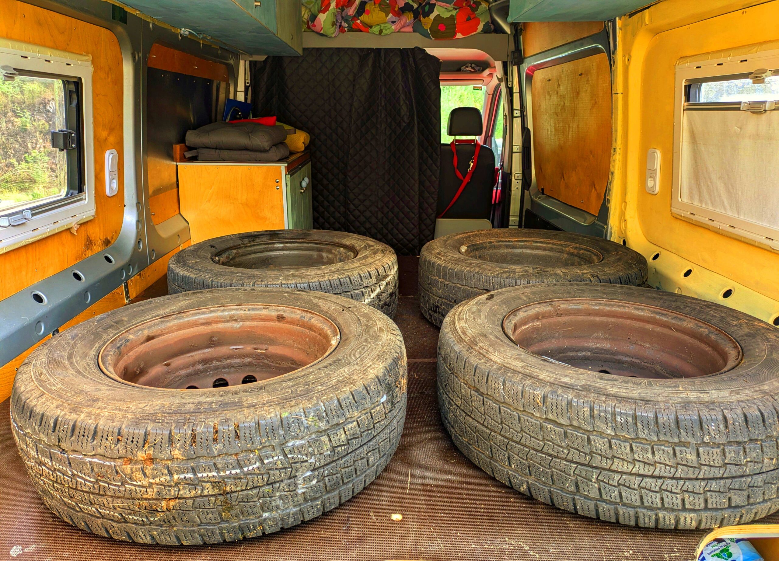 Bei dem Satz Winterreifen, den wir zusammen mit der BigBox erhalten haben, hat ein Pneu einen Höhenschlag – im Bild vorne links. Da ein genau passender leider nicht zu bekommen war, mussten wir zwei neue kaufen.